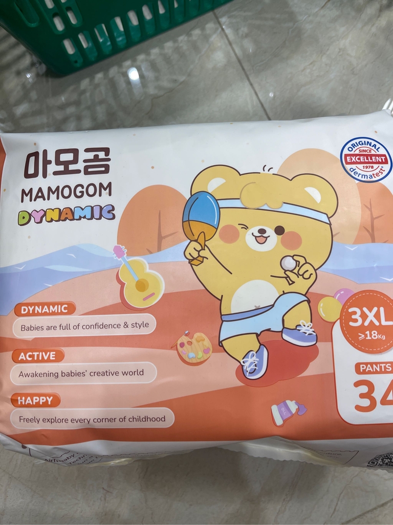 Bỉm quần Mamogom Dynamic (Baby Disposable pants), Loại quần mặc. Nhãn hiệu MAMOGOM, size3XL, đóng gói 34 chiếc/túi. Chất liệu: vải không dệt, hạt Polymer siêu hấp thụ và màng PE. Hàng mới 100%